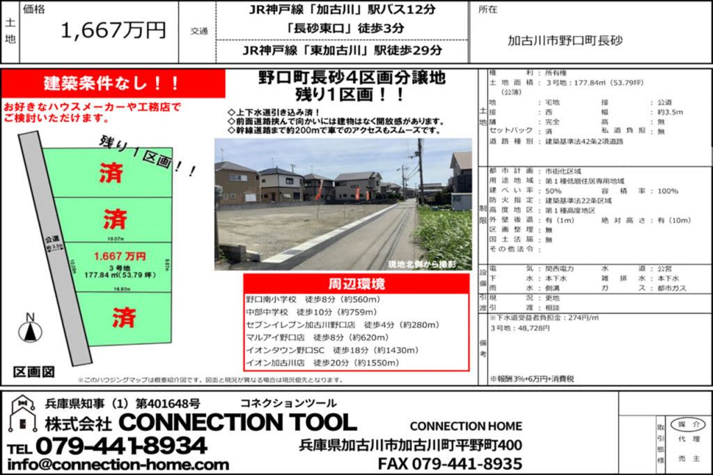野口南小学校(約560m・徒歩8分) 中部中学校(約759m・徒歩10分) ●セブンイレブン加古川野口店(約280m・徒歩4分)●マルアイ野口店(約620m・徒歩8分)●イオンタウン野口SC(約1430m・徒歩18分)●イオン加古川店(約1550m・徒歩20分) |